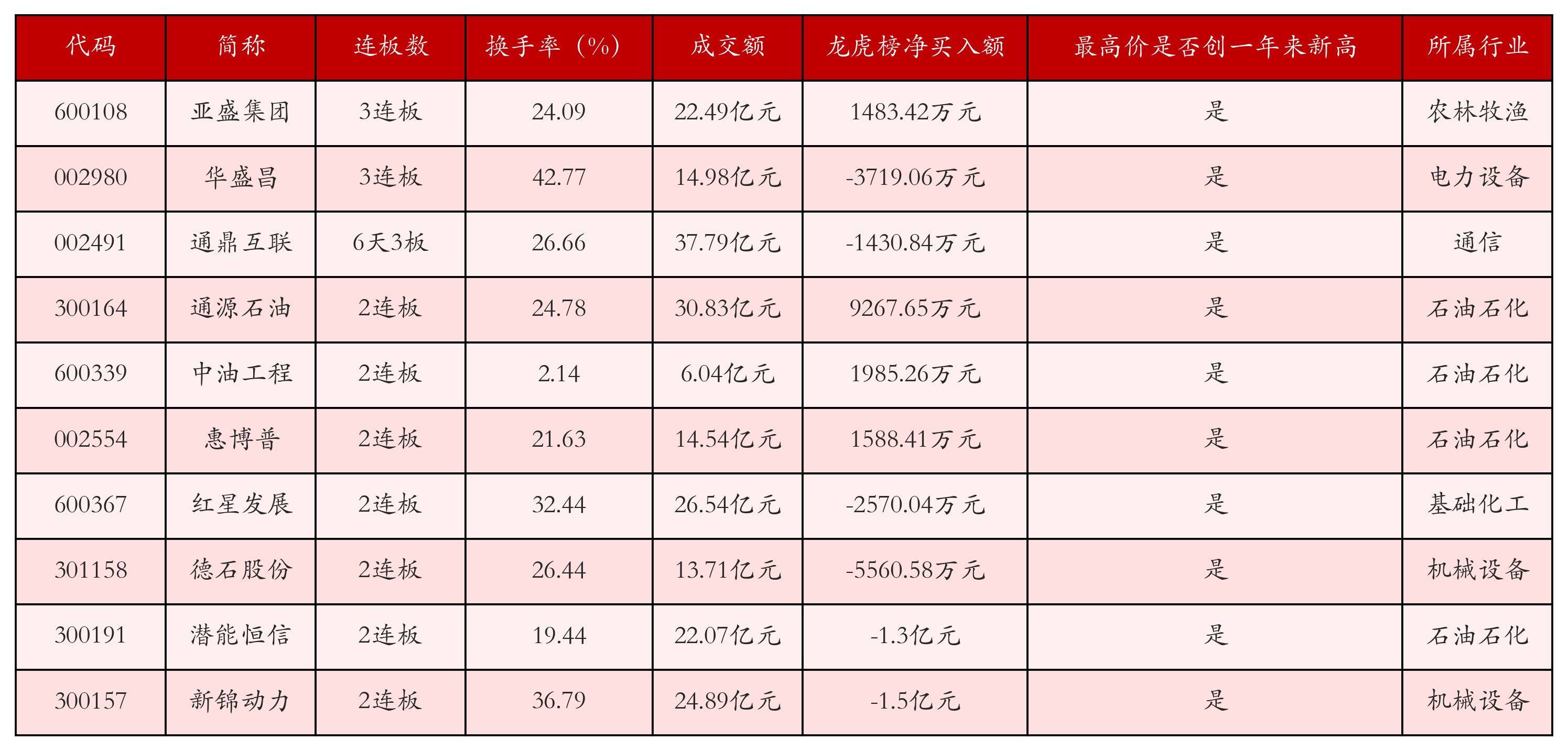 截至3月3日收盘,上证综指下跌1.43%,收于4122.68点,深证成指下跌3.07%,收于14022.39点,创业板指下跌2.57%,收于3209.48点。今日沪深两市A股共计80只涨停,综合当前连板数以及当日龙虎榜数据,其中较为强势的前三只个股分别为:亚盛集团(600108)、华盛昌(002980)与通鼎互联(002491)。今日强势个股前10位具体数据见下表: