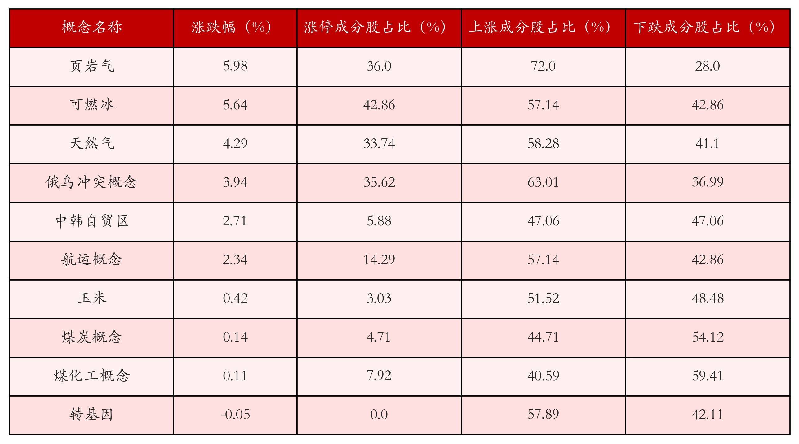 根据A股概念涨跌幅与所对应的股票池综合分析,涨幅靠前的三个概念板块分别为:页岩气、可燃冰与天然气。排名前10位的概念板块相关数据见下表:
